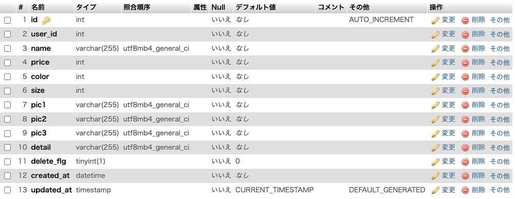 なお、productテーブルのpriceカラムをvarchar型で指定していましたが、値段を絞り込む際に、検索が機能しないことがわかりました。