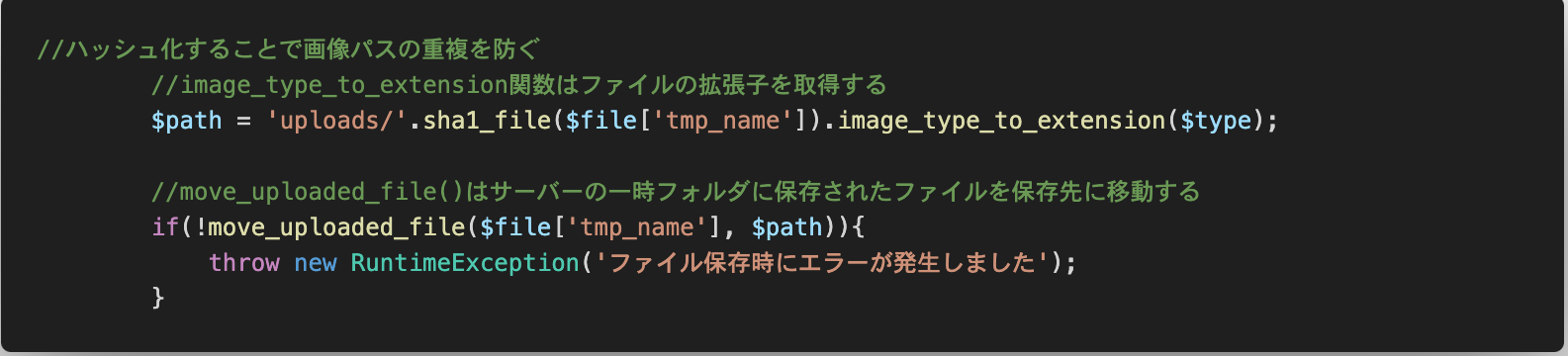また、画像パスの重複を防ぐためにハッシュ化したり、ファイルを保存するために、一時フォルダからの移動が必要である点なども勉強になりました。